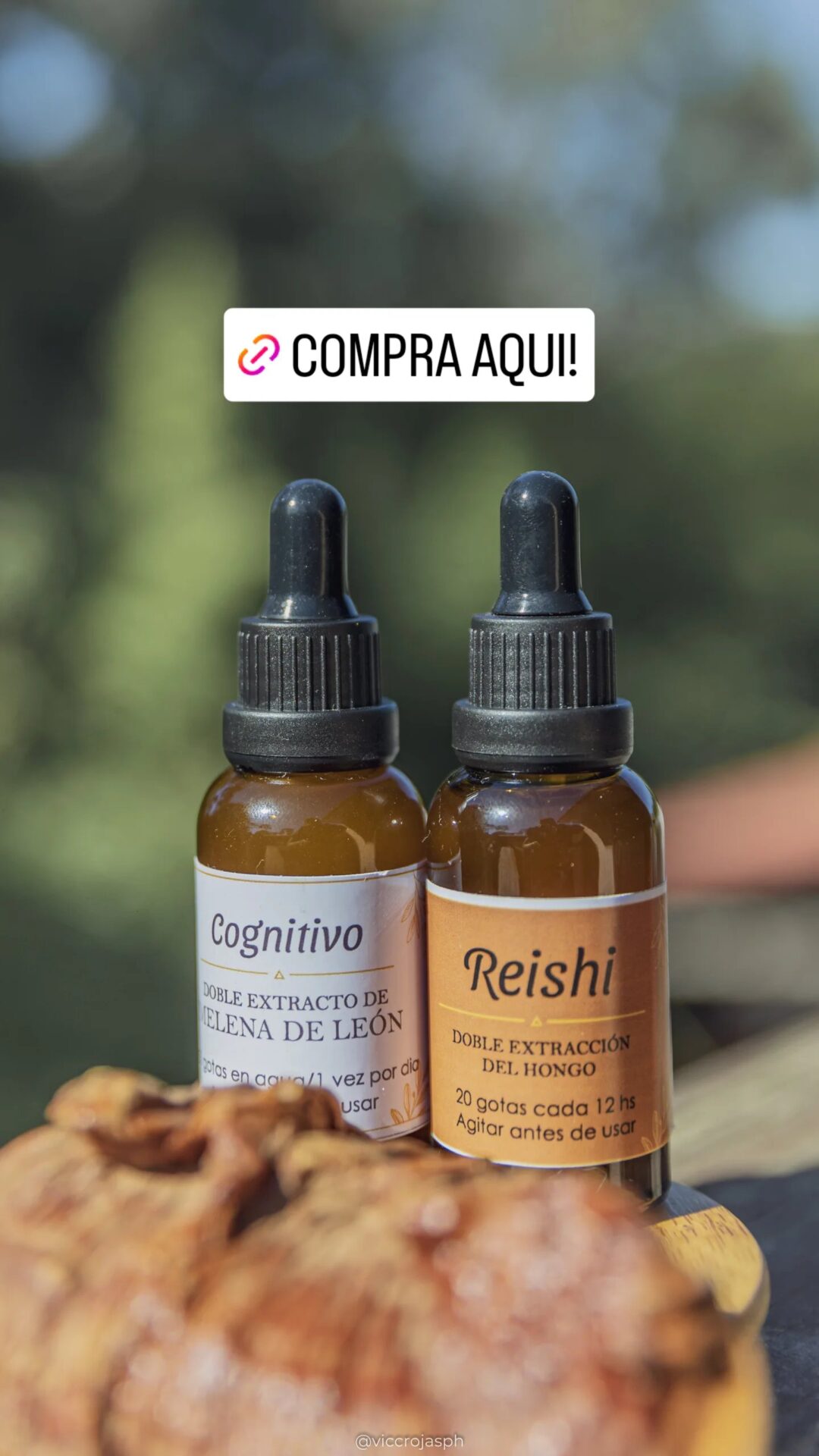 Tinturas de Melena de León y Reishi Ganoderma, elaboradas a partir de hongos de autocultivo, con doble extracción y 100% cuerpo fructífero, mediante 5 horas de cocción lenta, cuidando toda su potencia medicinal.